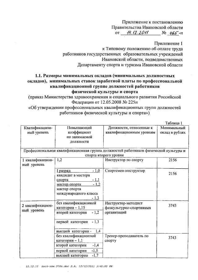 Постановление Правительства Ивановской области от 14.12.2011 N 465-п "О внесении изменения в постановление Правительства Ивановской области от 31.12.2008 N 378-п "О системе оплаты труда работников государственных образовательных учреждений Ивановской области, подведомственных Департаменту спорта и туризма Ивановской области"