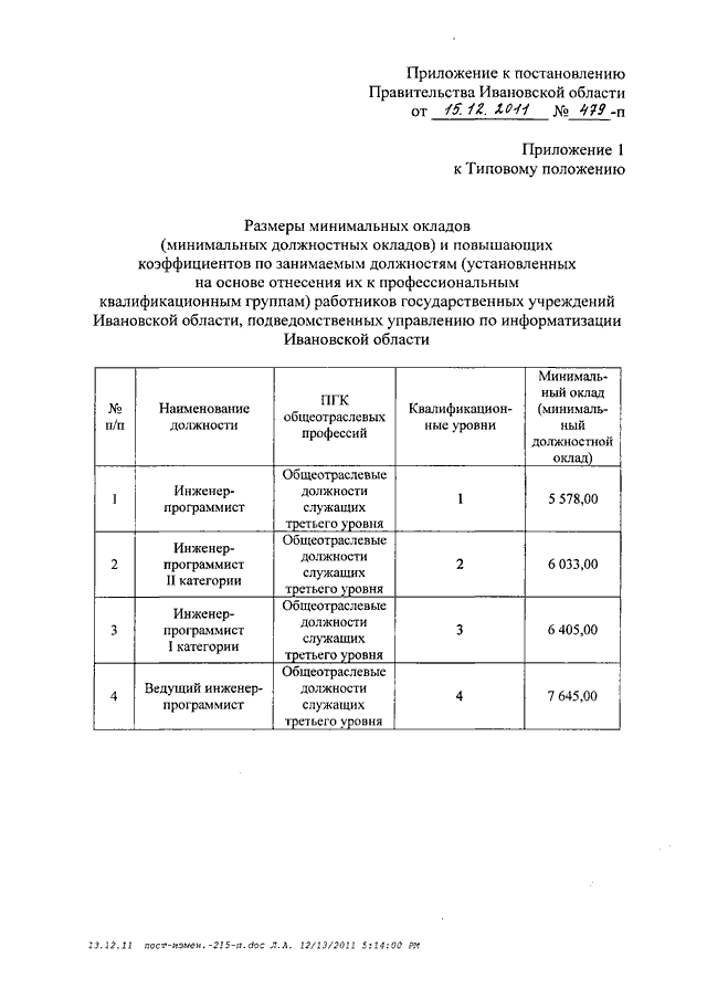 Постановление Правительства Ивановской области от 15.12.2011 N 479-п "О внесении изменений в постановление Правительства Ивановской области от 22.06.2011 N 215-п "О системе оплаты труда работников государственных учреждений Ивановской области, подведомственных управлению по информатизации Ивановской области"