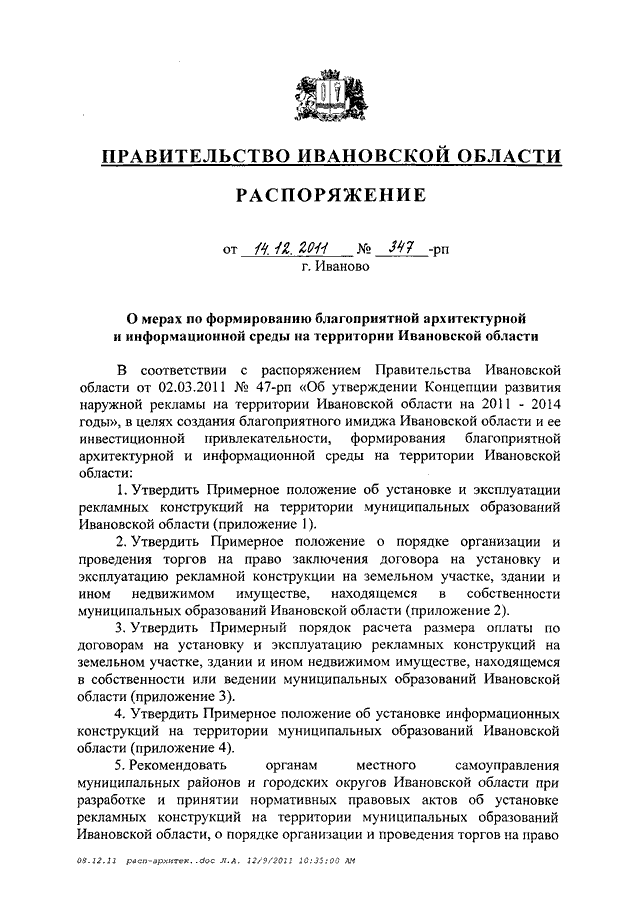 Распоряжение Правительства Ивановской области от 14.12.2011 N 347-рп "О мерах по формированию благоприятной архитектурной и информационной среды на территории Ивановской области" (вместе с "Примерным положением об установке и эксплуатации рекламных конструкций на территории муниципальных образований Ивановской области", "Примерным положением о порядке организации и проведения торгов на право заключения договора на установку и эксплуатацию рекламной конструкции на земельном участке, здании и ином недвижимом имуществе, находящемся в собственности муниципальных образований Ивановской области", "Примерным порядком расчета размера оплаты по договорам на установку и эксплуатацию рекламных конструкций на земельном участке, здании или ином недвижимом имуществе, находящемся в собственности или ведении муниципальных образований Ивановской области", "Примерным положением об установке информационных конструкций на территории муниципальных образований Ивановской области")