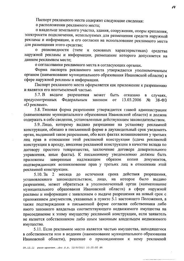 Распоряжение Правительства Ивановской области от 14.12.2011 N 347-рп "О мерах по формированию благоприятной архитектурной и информационной среды на территории Ивановской области" (вместе с "Примерным положением об установке и эксплуатации рекламных конструкций на территории муниципальных образований Ивановской области", "Примерным положением о порядке организации и проведения торгов на право заключения договора на установку и эксплуатацию рекламной конструкции на земельном участке, здании и ином недвижимом имуществе, находящемся в собственности муниципальных образований Ивановской области", "Примерным порядком расчета размера оплаты по договорам на установку и эксплуатацию рекламных конструкций на земельном участке, здании или ином недвижимом имуществе, находящемся в собственности или ведении муниципальных образований Ивановской области", "Примерным положением об установке информационных конструкций на территории муниципальных образований Ивановской области")