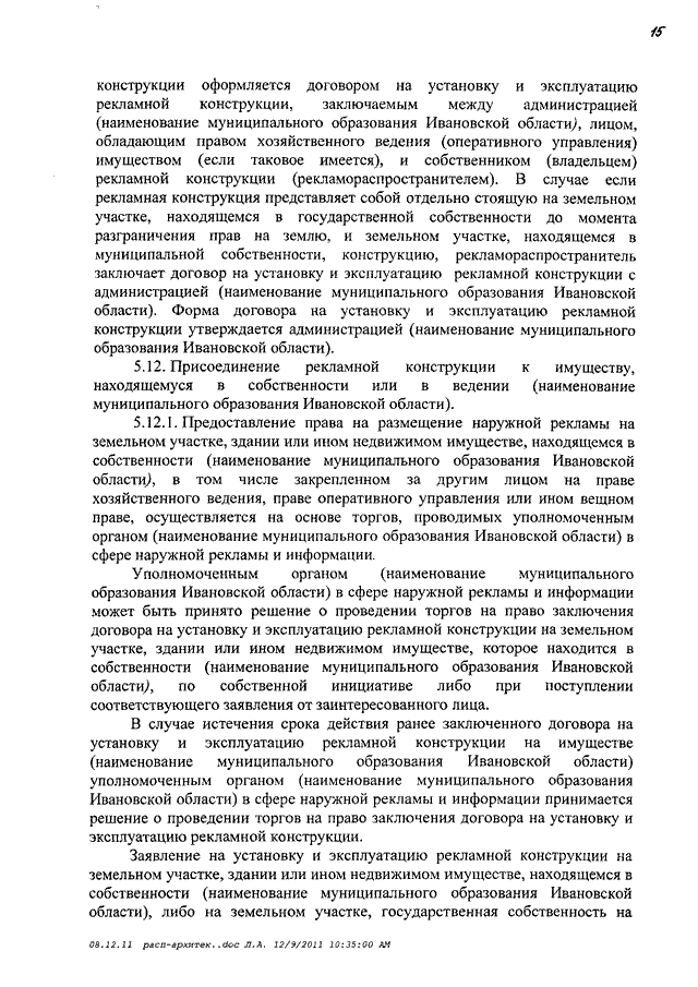 Распоряжение Правительства Ивановской области от 14.12.2011 N 347-рп "О мерах по формированию благоприятной архитектурной и информационной среды на территории Ивановской области" (вместе с "Примерным положением об установке и эксплуатации рекламных конструкций на территории муниципальных образований Ивановской области", "Примерным положением о порядке организации и проведения торгов на право заключения договора на установку и эксплуатацию рекламной конструкции на земельном участке, здании и ином недвижимом имуществе, находящемся в собственности муниципальных образований Ивановской области", "Примерным порядком расчета размера оплаты по договорам на установку и эксплуатацию рекламных конструкций на земельном участке, здании или ином недвижимом имуществе, находящемся в собственности или ведении муниципальных образований Ивановской области", "Примерным положением об установке информационных конструкций на территории муниципальных образований Ивановской области")