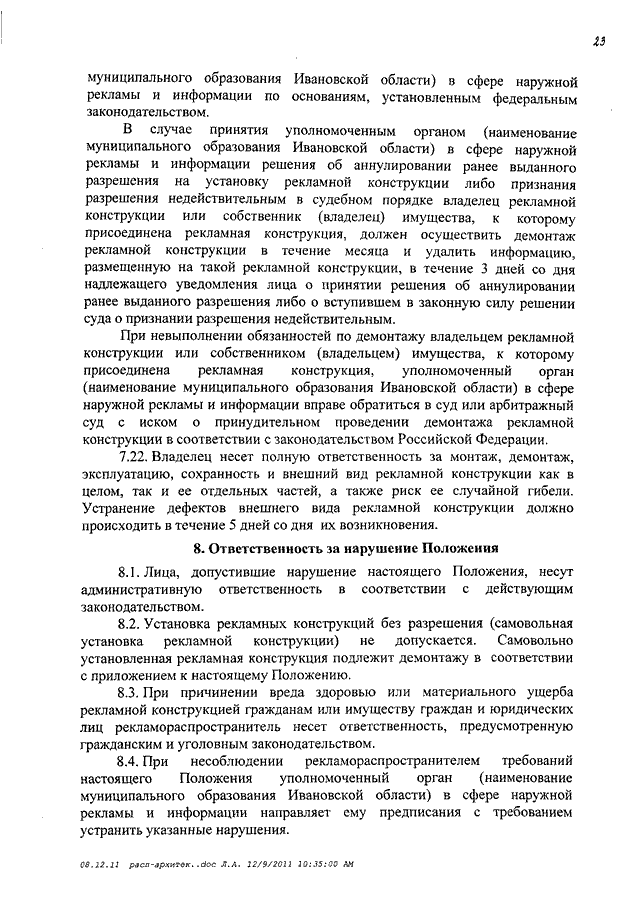 Распоряжение Правительства Ивановской области от 14.12.2011 N 347-рп "О мерах по формированию благоприятной архитектурной и информационной среды на территории Ивановской области" (вместе с "Примерным положением об установке и эксплуатации рекламных конструкций на территории муниципальных образований Ивановской области", "Примерным положением о порядке организации и проведения торгов на право заключения договора на установку и эксплуатацию рекламной конструкции на земельном участке, здании и ином недвижимом имуществе, находящемся в собственности муниципальных образований Ивановской области", "Примерным порядком расчета размера оплаты по договорам на установку и эксплуатацию рекламных конструкций на земельном участке, здании или ином недвижимом имуществе, находящемся в собственности или ведении муниципальных образований Ивановской области", "Примерным положением об установке информационных конструкций на территории муниципальных образований Ивановской области")