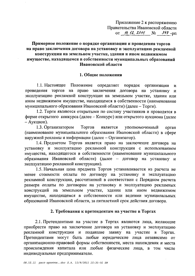 Распоряжение Правительства Ивановской области от 14.12.2011 N 347-рп "О мерах по формированию благоприятной архитектурной и информационной среды на территории Ивановской области" (вместе с "Примерным положением об установке и эксплуатации рекламных конструкций на территории муниципальных образований Ивановской области", "Примерным положением о порядке организации и проведения торгов на право заключения договора на установку и эксплуатацию рекламной конструкции на земельном участке, здании и ином недвижимом имуществе, находящемся в собственности муниципальных образований Ивановской области", "Примерным порядком расчета размера оплаты по договорам на установку и эксплуатацию рекламных конструкций на земельном участке, здании или ином недвижимом имуществе, находящемся в собственности или ведении муниципальных образований Ивановской области", "Примерным положением об установке информационных конструкций на территории муниципальных образований Ивановской области")