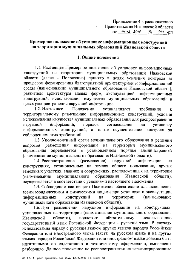 Распоряжение Правительства Ивановской области от 14.12.2011 N 347-рп "О мерах по формированию благоприятной архитектурной и информационной среды на территории Ивановской области" (вместе с "Примерным положением об установке и эксплуатации рекламных конструкций на территории муниципальных образований Ивановской области", "Примерным положением о порядке организации и проведения торгов на право заключения договора на установку и эксплуатацию рекламной конструкции на земельном участке, здании и ином недвижимом имуществе, находящемся в собственности муниципальных образований Ивановской области", "Примерным порядком расчета размера оплаты по договорам на установку и эксплуатацию рекламных конструкций на земельном участке, здании или ином недвижимом имуществе, находящемся в собственности или ведении муниципальных образований Ивановской области", "Примерным положением об установке информационных конструкций на территории муниципальных образований Ивановской области")