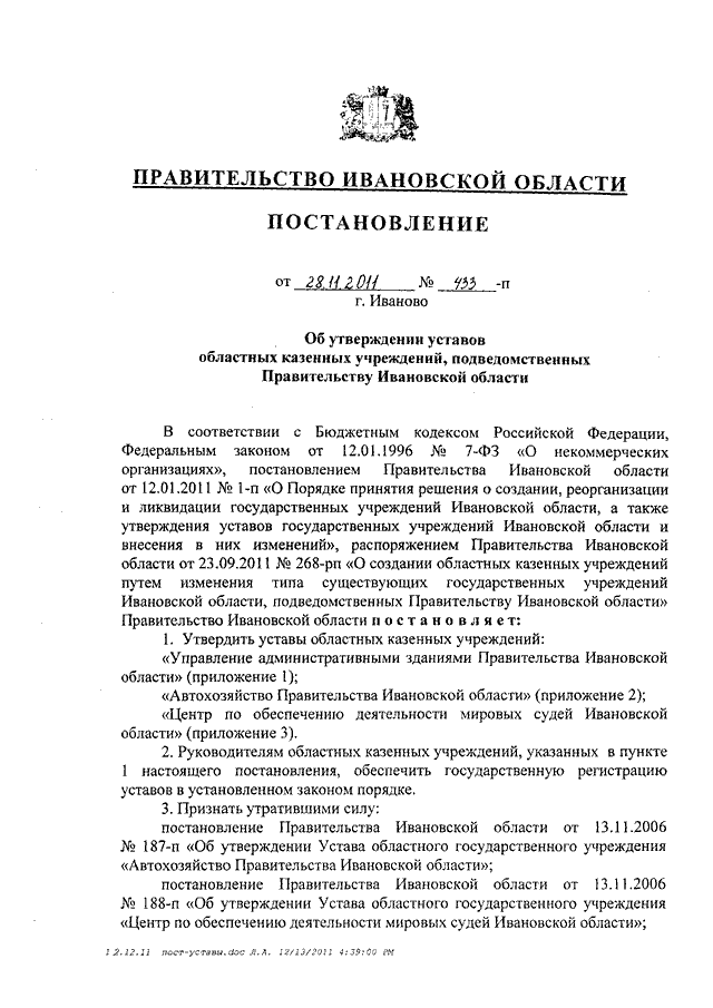 Постановление Правительства Ивановской области от 28.11.2011 N 433-п "Об утверждении уставов областных казенных учреждений, подведомственных Правительству Ивановской области" (вместе с "Уставом областного казенного учреждения "Управление административными зданиями Правительства Ивановской области", "Уставом областного казенного учреждения "Автохозяйство Правительства Ивановской области", "Уставом областного казенного учреждения "Центр по обеспечению деятельности мировых судей Ивановской области")