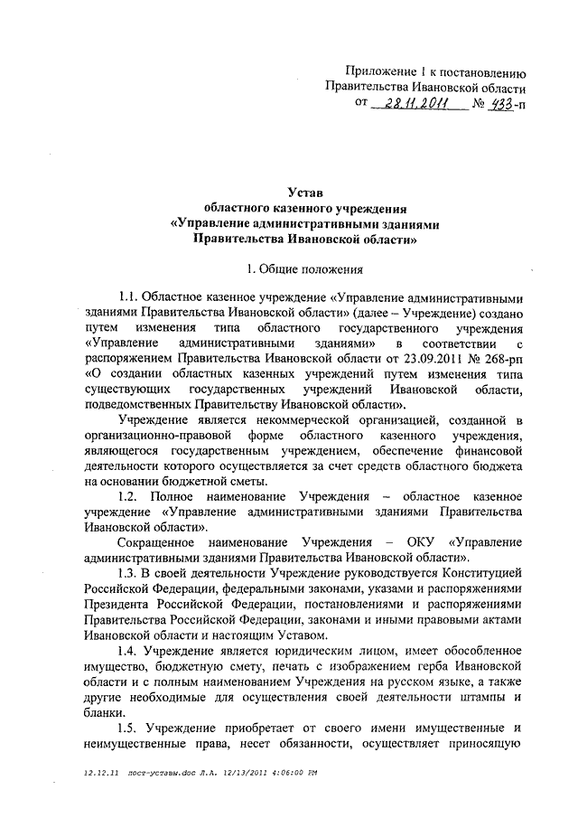 Постановление Правительства Ивановской области от 28.11.2011 N 433-п "Об утверждении уставов областных казенных учреждений, подведомственных Правительству Ивановской области" (вместе с "Уставом областного казенного учреждения "Управление административными зданиями Правительства Ивановской области", "Уставом областного казенного учреждения "Автохозяйство Правительства Ивановской области", "Уставом областного казенного учреждения "Центр по обеспечению деятельности мировых судей Ивановской области")