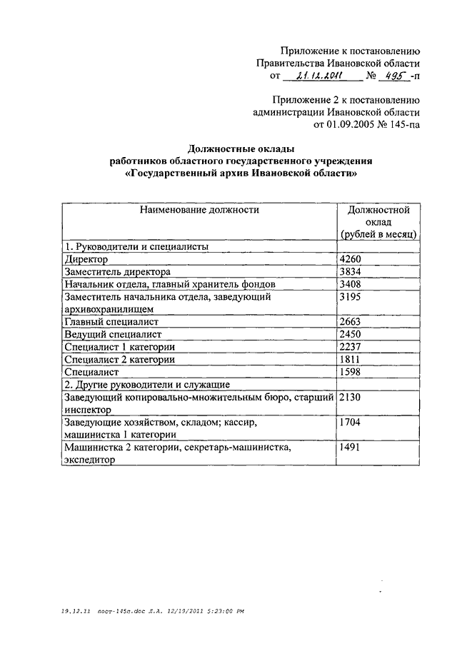 Постановление Правительства Ивановской области от 21.12.2011 N 495-п "О внесении изменения в постановление администрации Ивановской области от 01.09.2005 N 145-па "Об оплате труда работников государственных учреждений Ивановской области"