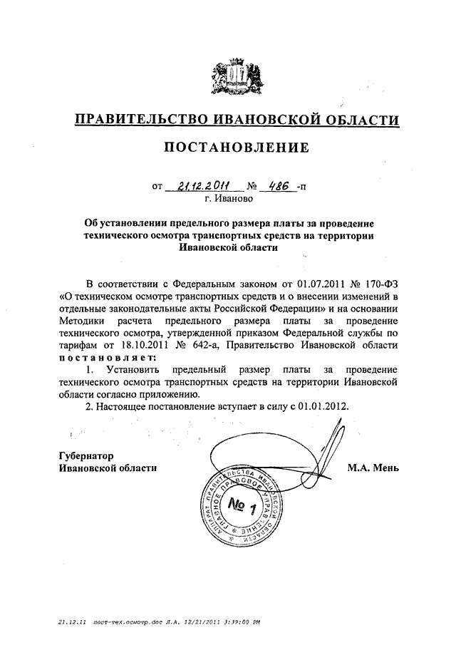 Постановление Правительства Ивановской области от 21.12.2011 N 486-п "Об установлении предельного размера платы за проведение технического осмотра транспортных средств на территории Ивановской области"