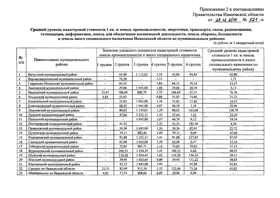 Постановление Правительства Ивановской области от 28.12.2011 N 521-п "Об утверждении результатов государственной кадастровой оценки земель промышленности, энергетики, транспорта, связи, радиовещания, телевидения, информатики, земель для обеспечения космической деятельности, земель обороны, безопасности и земель иного специального назначения Ивановской области"