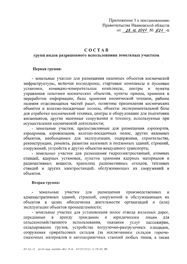 Постановление Правительства Ивановской области от 28.12.2011 N 521-п "Об утверждении результатов государственной кадастровой оценки земель промышленности, энергетики, транспорта, связи, радиовещания, телевидения, информатики, земель для обеспечения космической деятельности, земель обороны, безопасности и земель иного специального назначения Ивановской области"