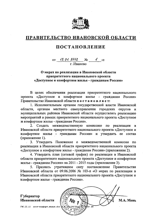 Постановление Правительства Ивановской области от 13.01.2012 N 1-п "О мерах по реализации в Ивановской области приоритетного национального проекта "Доступное и комфортное жилье - гражданам России" (вместе с "Положением о межведомственной комиссии по реализации в Ивановской области приоритетного национального проекта "Доступное и комфортное жилье - гражданам России", "Планом (сетевым графиком) по реализации в Ивановской области приоритетного национального проекта "Доступное и комфортное жилье - гражданам России" на 2011 - 2015 годы")