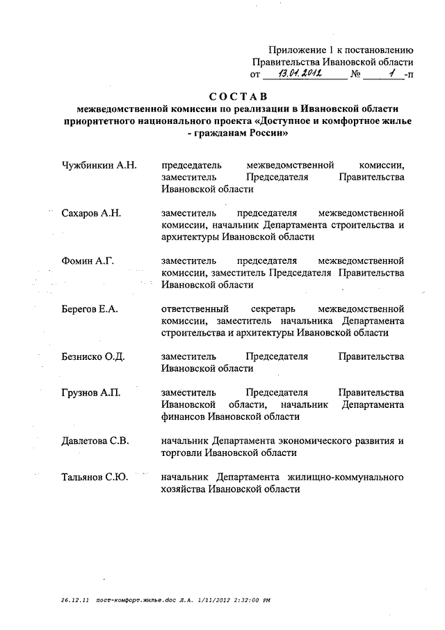 Постановление Правительства Ивановской области от 13.01.2012 N 1-п "О мерах по реализации в Ивановской области приоритетного национального проекта "Доступное и комфортное жилье - гражданам России" (вместе с "Положением о межведомственной комиссии по реализации в Ивановской области приоритетного национального проекта "Доступное и комфортное жилье - гражданам России", "Планом (сетевым графиком) по реализации в Ивановской области приоритетного национального проекта "Доступное и комфортное жилье - гражданам России" на 2011 - 2015 годы")