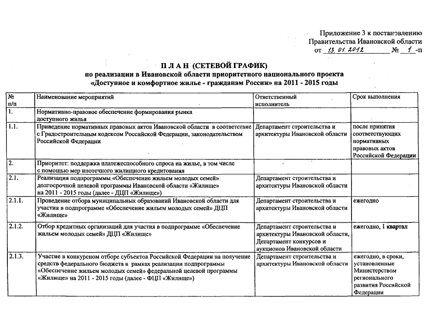 Постановление Правительства Ивановской области от 13.01.2012 N 1-п "О мерах по реализации в Ивановской области приоритетного национального проекта "Доступное и комфортное жилье - гражданам России" (вместе с "Положением о межведомственной комиссии по реализации в Ивановской области приоритетного национального проекта "Доступное и комфортное жилье - гражданам России", "Планом (сетевым графиком) по реализации в Ивановской области приоритетного национального проекта "Доступное и комфортное жилье - гражданам России" на 2011 - 2015 годы")