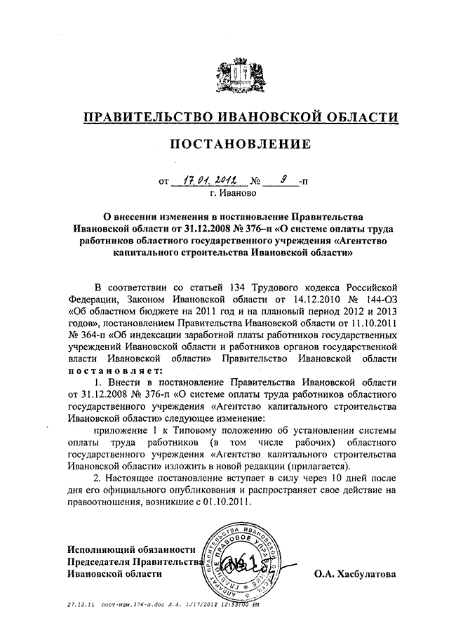 Постановление Правительства Ивановской области от 17.01.2012 N 9-п "О внесении изменения в постановление Правительства Ивановской области от 31.12.2008 N 376-п "О системе оплаты труда работников областного государственного учреждения "Агентство капитального строительства Ивановской области"