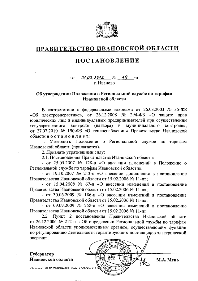 Постановление Правительства Ивановской области от 01.02.2012 N 19-п "Об утверждении Положения о Региональной службе по тарифам Ивановской области"