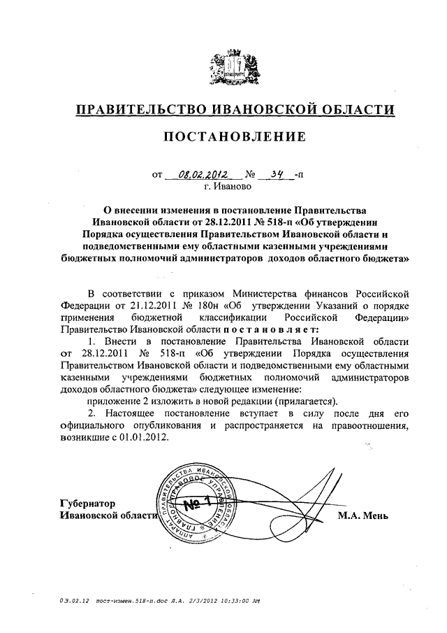 Постановление Правительства Ивановской области от 08.02.2012 N 34-п "О внесении изменения в постановление Правительства Ивановской области от 28.12.2011 N 518-п "Об утверждении Порядка осуществления Правительством Ивановской области и подведомственными ему областными казенными учреждениями бюджетных полномочий администраторов доходов областного бюджета" (вместе с "Перечнем администраторов доходов областного бюджета и закрепленных за ними источников доходов областного бюджета")