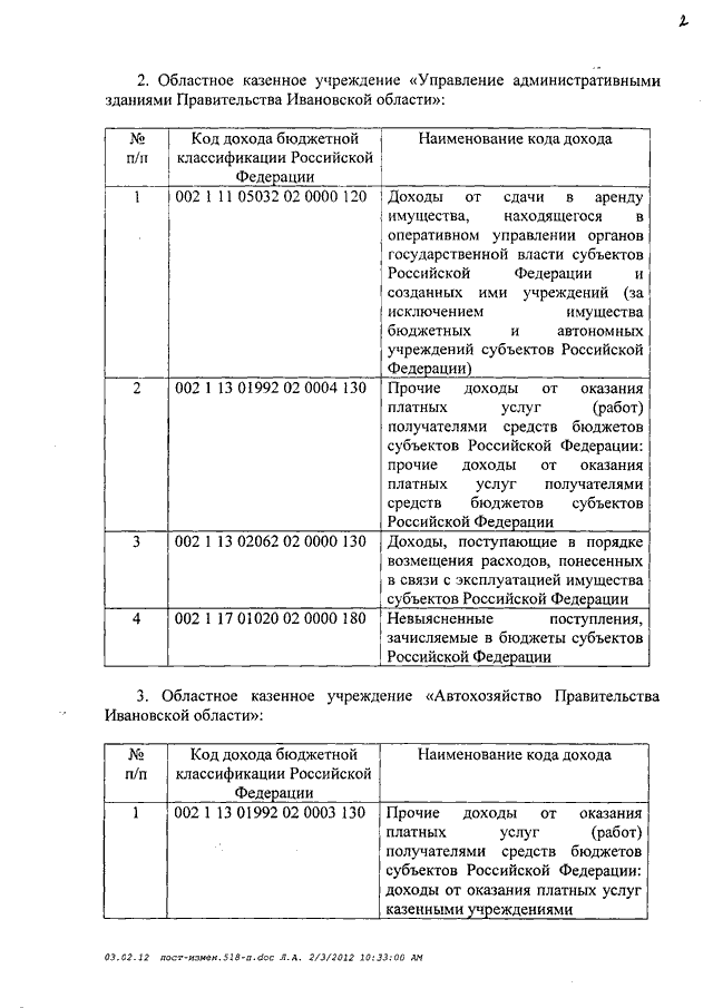 Постановление Правительства Ивановской области от 08.02.2012 N 34-п "О внесении изменения в постановление Правительства Ивановской области от 28.12.2011 N 518-п "Об утверждении Порядка осуществления Правительством Ивановской области и подведомственными ему областными казенными учреждениями бюджетных полномочий администраторов доходов областного бюджета" (вместе с "Перечнем администраторов доходов областного бюджета и закрепленных за ними источников доходов областного бюджета")
