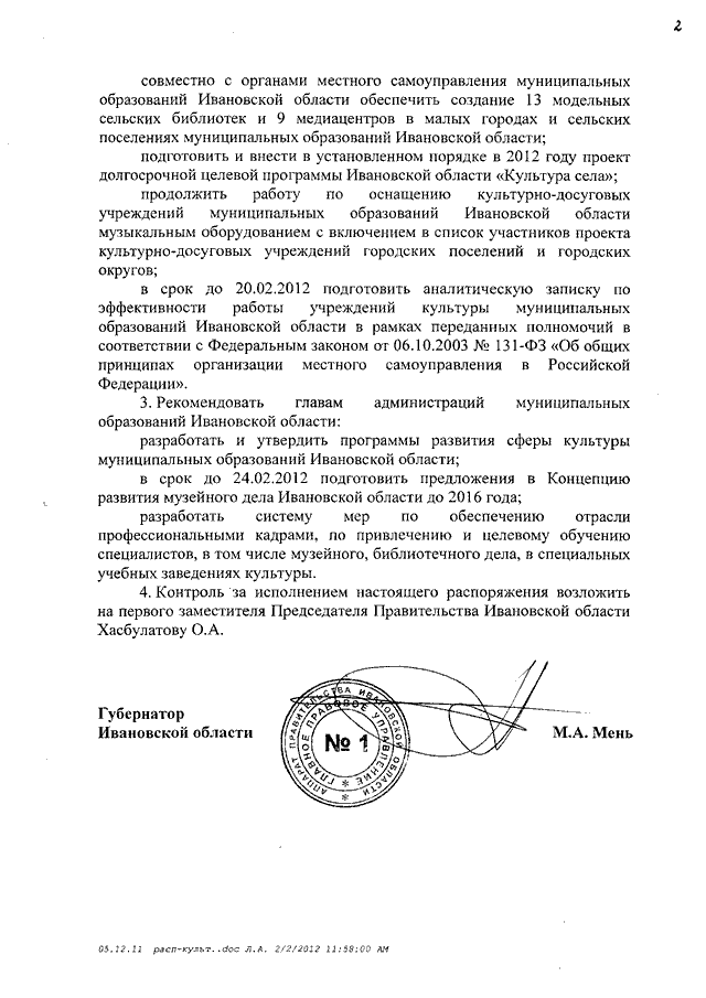 Распоряжение Правительства Ивановской области от 07.02.2012 N 25-рп "О мерах по развитию культуры малых городов и сельских поселений Ивановской области на 2011 - 2015 годы"