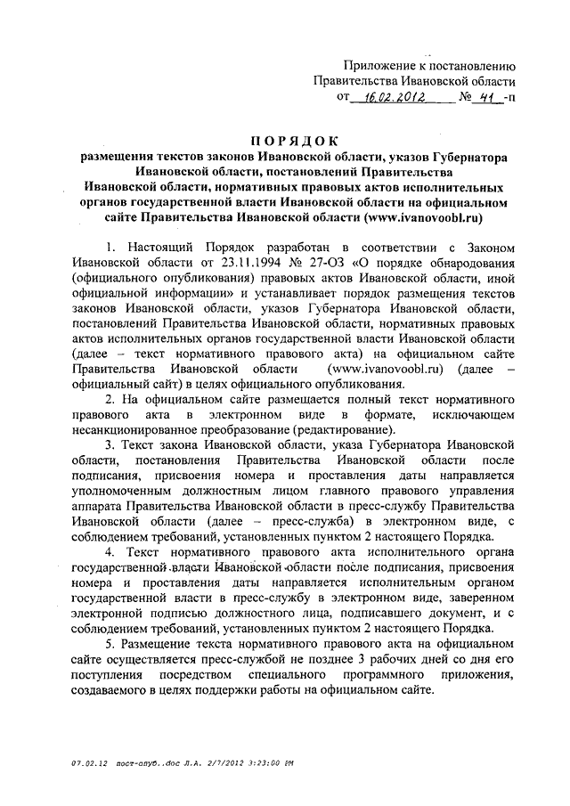 Постановление Правительства Ивановской области от 16.02.2012 N 41-п "Об утверждении Порядка размещения текстов законов Ивановской области, указов Губернатора Ивановской области, постановлений Правительства Ивановской области, нормативных правовых актов исполнительных органов государственной власти Ивановской области на официальном сайте Правительства Ивановской области (www.ivanovoobl.ru)"