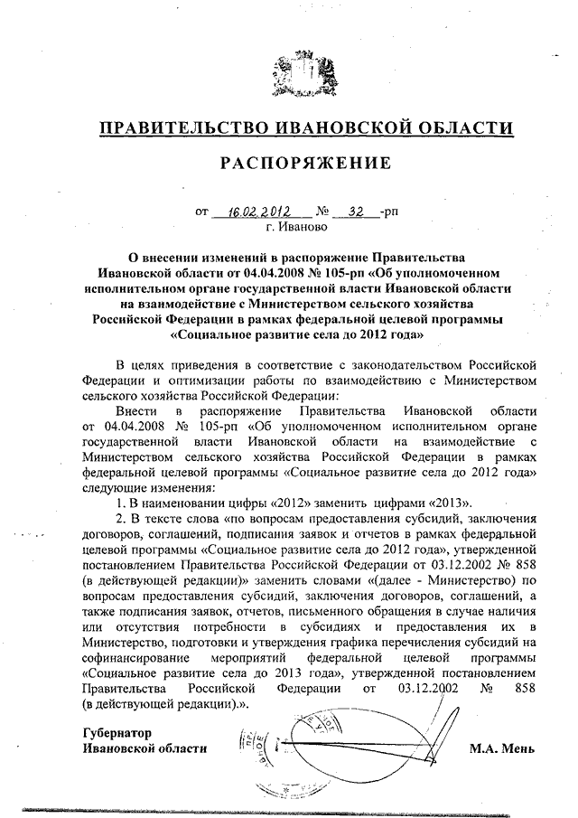 Распоряжение Правительства Ивановской области от 16.02.2012 N 32-рп "О внесении изменений в распоряжение Правительства Ивановской области от 04.04.2008 N 105-рп "Об уполномоченном исполнительном органе государственной власти Ивановской области на взаимодействие с Министерством сельского хозяйства Российской Федерации в рамках федеральной целевой программы "Социальное развитие села до 2012 года"