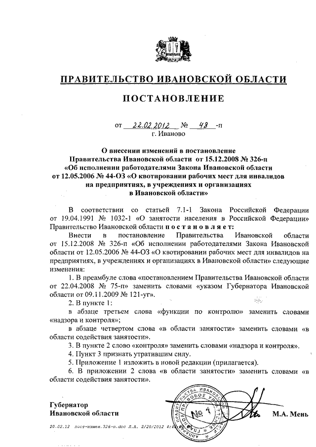 Постановление Правительства Ивановской области от 22.02.2012 N 48-п "О внесении изменений в постановление Правительства Ивановской области от 15.12.2008 N 326-п "Об исполнении работодателями Закона Ивановской области от 12.05.2006 N 44-ОЗ "О квотировании рабочих мест для инвалидов на предприятиях, в учреждениях и организациях в Ивановской области" (вместе с "Перечнем должностных лиц комитета Ивановской области по труду, содействию занятости населения и трудовой миграции, уполномоченных выдавать обязательные для исполнения предписания об устранении нарушений законодательства о занятости населения и составлять протоколы об административных правонарушениях, предусмотренных статьями 5.42, 19.7 Кодекса Российской Федерации об административных правонарушениях, на территории Ивановской области")