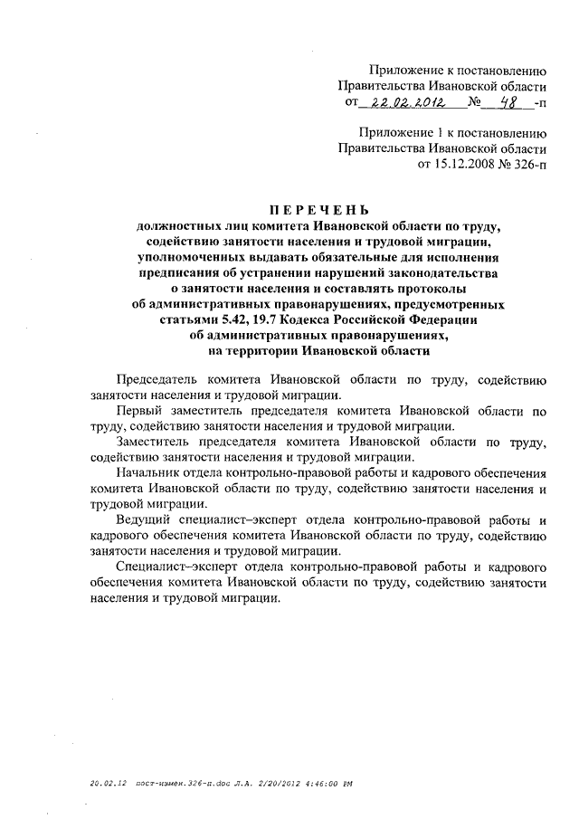 Постановление Правительства Ивановской области от 22.02.2012 N 48-п "О внесении изменений в постановление Правительства Ивановской области от 15.12.2008 N 326-п "Об исполнении работодателями Закона Ивановской области от 12.05.2006 N 44-ОЗ "О квотировании рабочих мест для инвалидов на предприятиях, в учреждениях и организациях в Ивановской области" (вместе с "Перечнем должностных лиц комитета Ивановской области по труду, содействию занятости населения и трудовой миграции, уполномоченных выдавать обязательные для исполнения предписания об устранении нарушений законодательства о занятости населения и составлять протоколы об административных правонарушениях, предусмотренных статьями 5.42, 19.7 Кодекса Российской Федерации об административных правонарушениях, на территории Ивановской области")