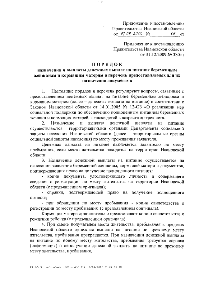 Постановление Правительства Ивановской области от 07.03.2012 N 65-п "О внесении изменений в постановление Правительства Ивановской области от 31.12.2009 N 380-п "Об утверждении порядка назначения и выплаты денежных выплат на питание беременным женщинам и кормящим матерям и перечня предоставляемых для их назначения документов"