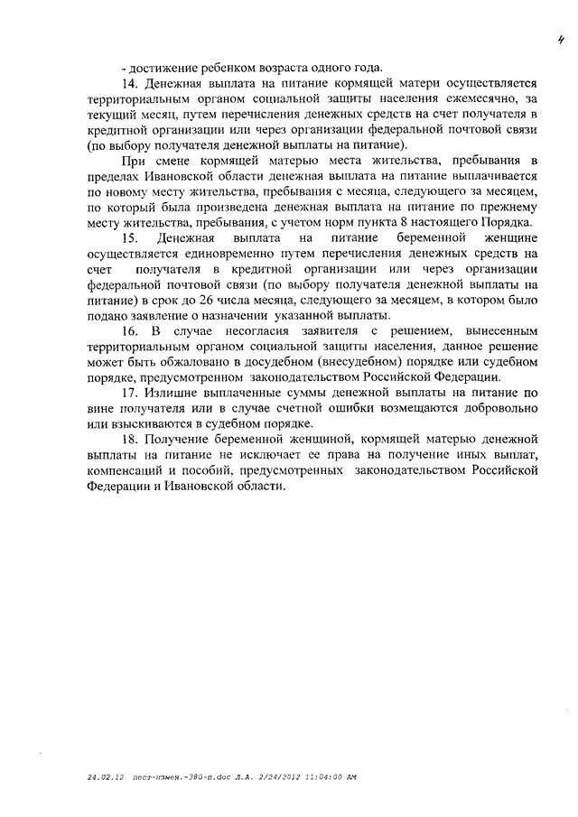 Постановление Правительства Ивановской области от 07.03.2012 N 65-п "О внесении изменений в постановление Правительства Ивановской области от 31.12.2009 N 380-п "Об утверждении порядка назначения и выплаты денежных выплат на питание беременным женщинам и кормящим матерям и перечня предоставляемых для их назначения документов"