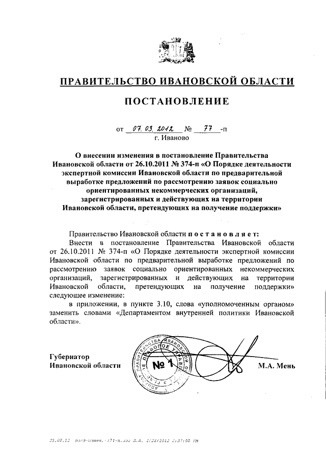 Постановление Правительства Ивановской области от 07.03.2012 N 77-п "О внесении изменения в постановление Правительства Ивановской области от 26.10.2011 N 374-п "О Порядке деятельности экспертной комиссии Ивановской области по предварительной выработке предложений по рассмотрению заявок социально ориентированных некоммерческих организаций, зарегистрированных и действующих на территории Ивановской области, претендующих на получение поддержки"