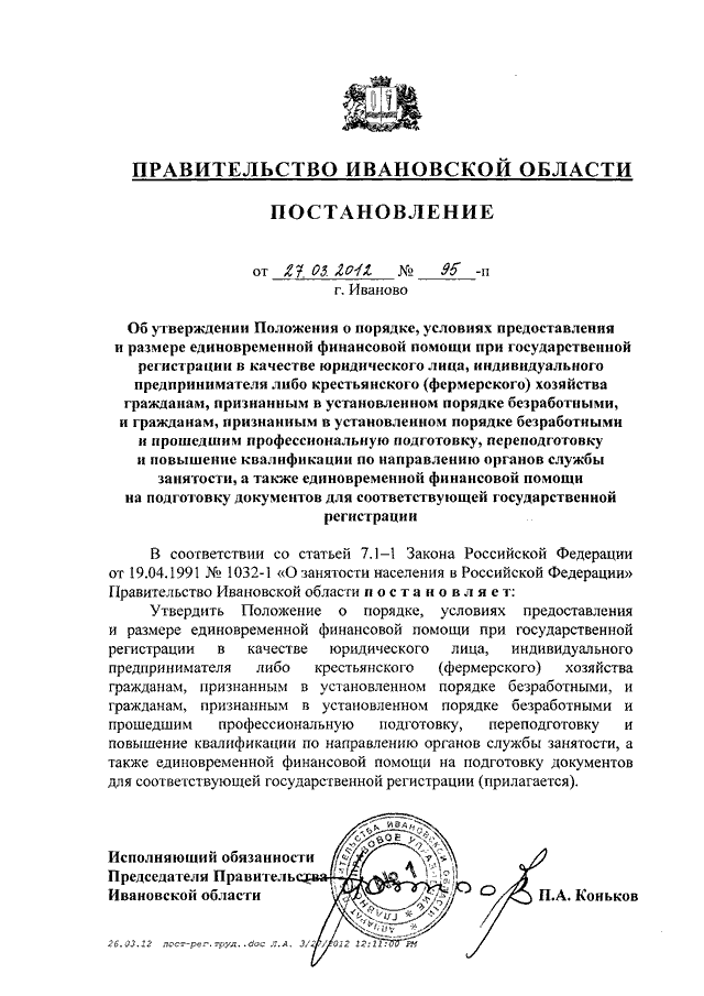 Постановление Правительства Ивановской области от 27.03.2012 N 95-п "Об утверждении Положения о порядке, условиях предоставления и размере единовременной финансовой помощи при государственной регистрации в качестве юридического лица, индивидуального предпринимателя либо крестьянского (фермерского) хозяйства гражданам, признанным в установленном порядке безработными, и гражданам, признанным в установленном порядке безработными и прошедшим профессиональную подготовку, переподготовку и повышение квалификации по направлению органов службы занятости, а также единовременной финансовой помощи на подготовку документов для соответствующей государственной регистрации"