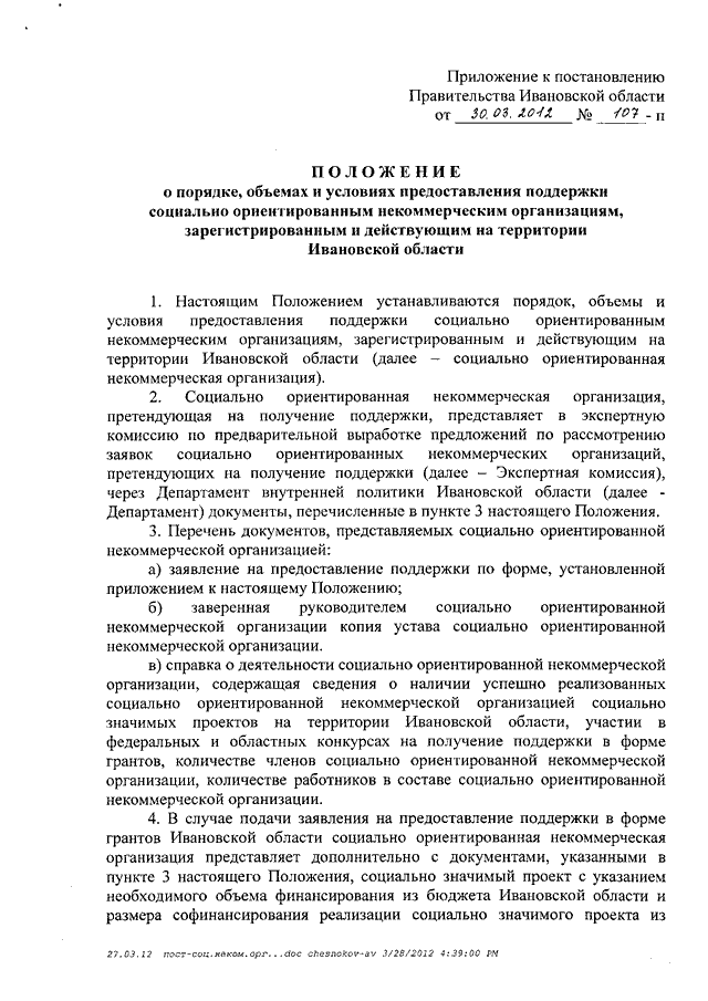 Постановление Правительства Ивановской области от 30.03.2012 N 107-п "О порядке, объемах и условиях предоставления поддержки социально ориентированным некоммерческим организациям, зарегистрированным и действующим на территории Ивановской области" (вместе с "Положением о порядке, объемах и условиях предоставления поддержки социально ориентированным некоммерческим организациям, зарегистрированным и действующим на территории Ивановской области")