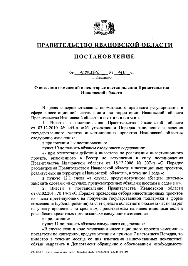 Постановление Правительства Ивановской области от 11.04.2012 N 116-п "О внесении изменений в некоторые постановления Правительства Ивановской области"