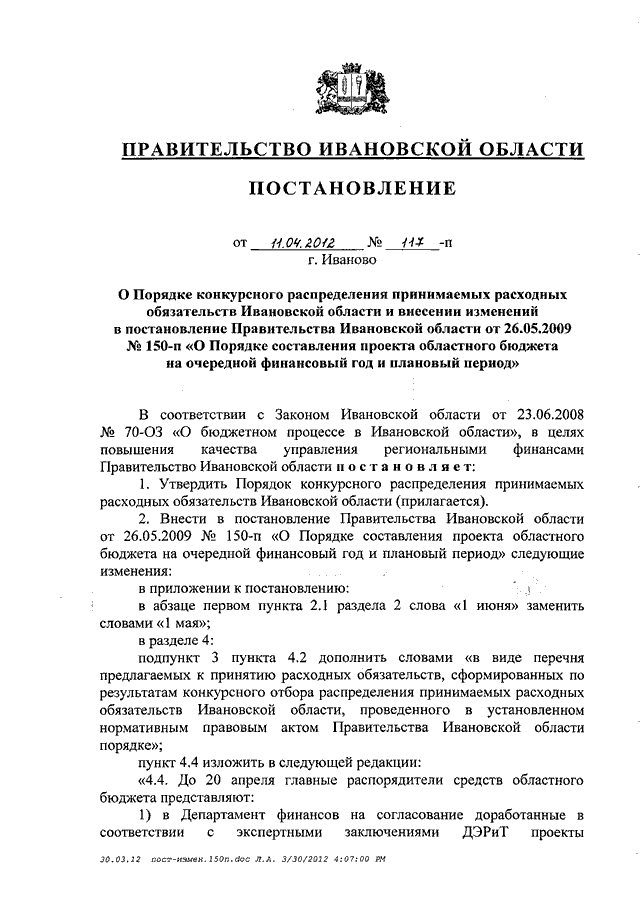 Постановление Правительства Ивановской области от 11.04.2012 N 117-п "О Порядке конкурсного распределения принимаемых расходных обязательств Ивановской области и внесении изменений в постановление Правительства Ивановской области от 26.05.2009 N 150-п "О Порядке составления проекта областного бюджета на очередной финансовый год и плановый период"