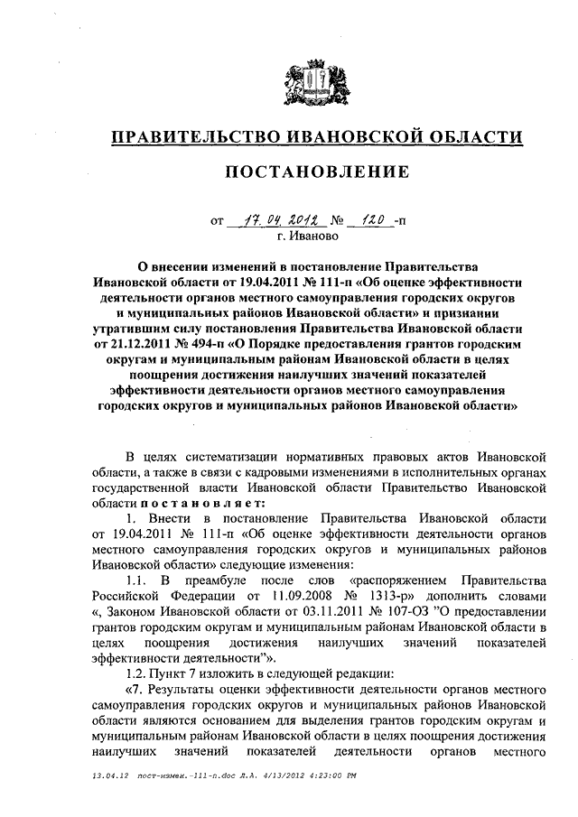 Постановление Правительства Ивановской области от 17.04.2012 N 120-п "О внесении изменений в постановление Правительства Ивановской области от 19.04.2011 N 111-п "Об оценке эффективности деятельности органов местного самоуправления городских округов и муниципальных районов Ивановской области" и признании утратившим силу постановления Правительства Ивановской области от 21.12.2011 N 494-п "О Порядке предоставления грантов городским округам и муниципальным районам Ивановской области в целях поощрения достижения наилучших значений показателей эффективности деятельности органов местного самоуправления городских округов и муниципальных районов Ивановской области"
