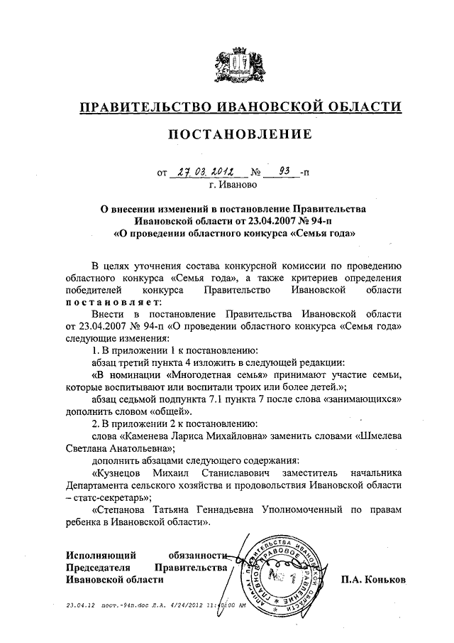 Постановление Правительства Ивановской области от 27.03.2012 N 93-п "О внесении изменений в постановление Правительства Ивановской области от 23.04.2007 N 94-п "О проведении областного конкурса "Семья года"
