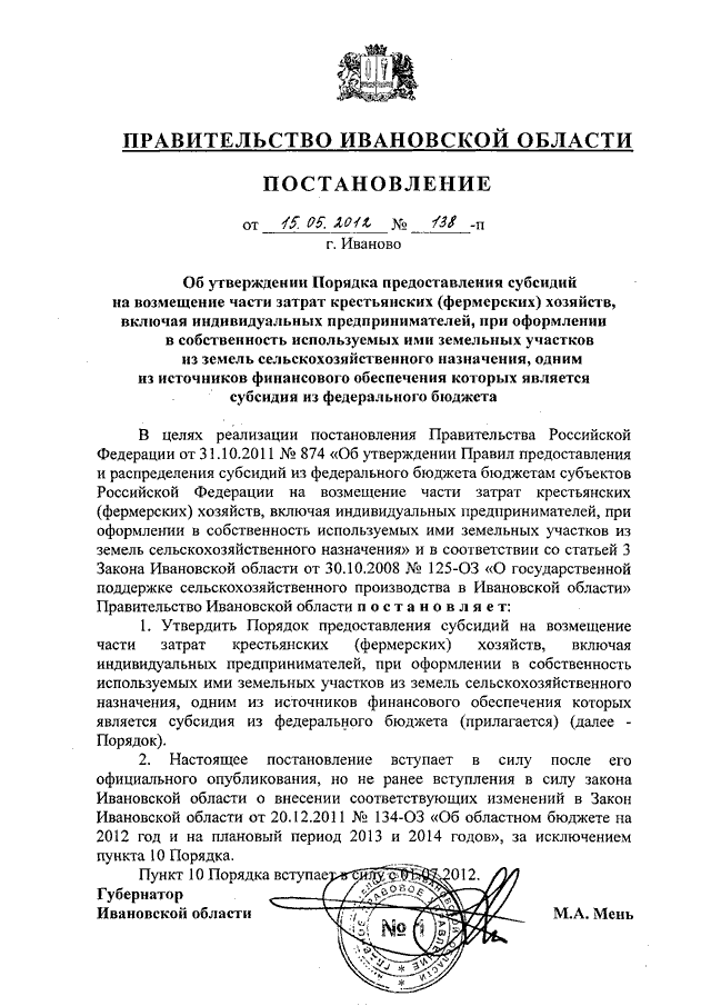 Постановление Правительства Ивановской области от 15.05.2012 N 138-п "Об утверждении Порядка предоставления субсидий на возмещение части затрат крестьянских (фермерских) хозяйств, включая индивидуальных предпринимателей, при оформлении в собственность используемых ими земельных участков из земель сельскохозяйственного назначения, одним из источников финансового обеспечения которых является субсидия из федерального бюджета"