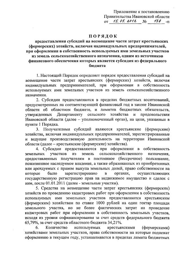 Постановление Правительства Ивановской области от 15.05.2012 N 138-п "Об утверждении Порядка предоставления субсидий на возмещение части затрат крестьянских (фермерских) хозяйств, включая индивидуальных предпринимателей, при оформлении в собственность используемых ими земельных участков из земель сельскохозяйственного назначения, одним из источников финансового обеспечения которых является субсидия из федерального бюджета"