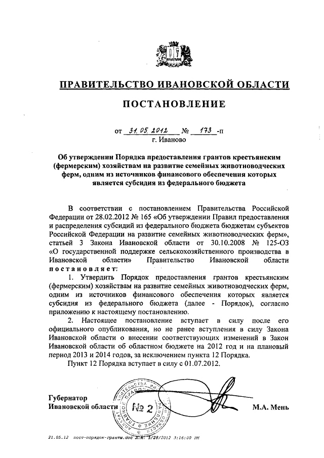 Постановление Правительства Ивановской области от 31.05.2012 N 173-п "Об утверждении Порядка предоставления грантов крестьянским (фермерским) хозяйствам на развитие семейных животноводческих ферм, одним из источников финансового обеспечения которых является субсидия из федерального бюджета"
