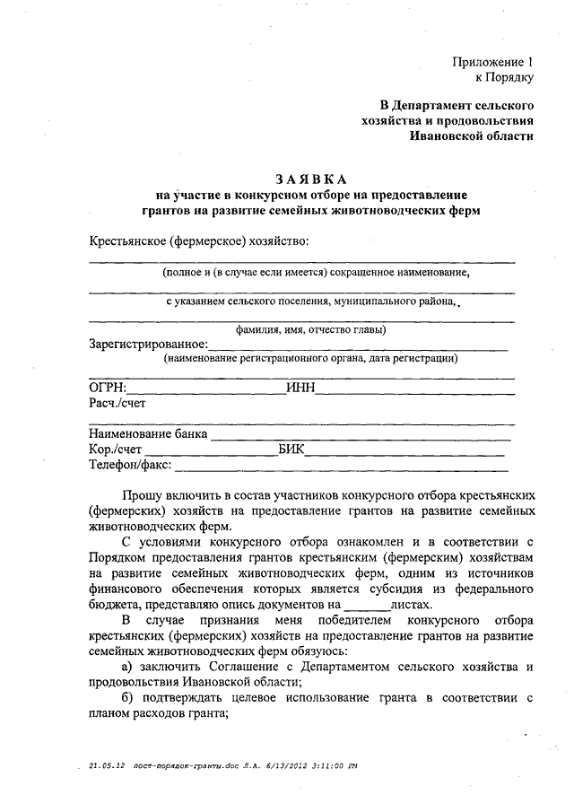 Постановление Правительства Ивановской области от 31.05.2012 N 173-п "Об утверждении Порядка предоставления грантов крестьянским (фермерским) хозяйствам на развитие семейных животноводческих ферм, одним из источников финансового обеспечения которых является субсидия из федерального бюджета"