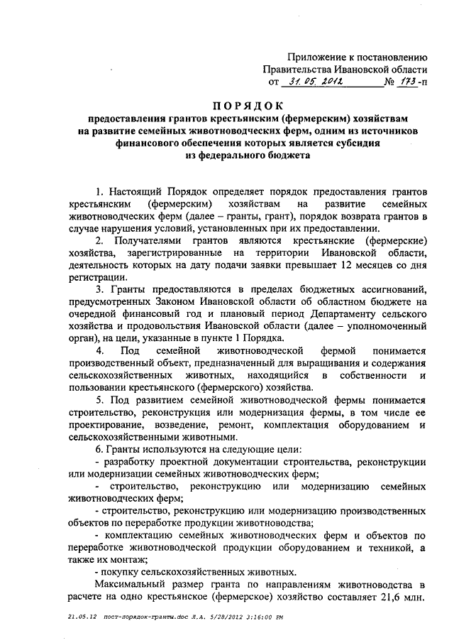 Постановление Правительства Ивановской области от 31.05.2012 N 173-п "Об утверждении Порядка предоставления грантов крестьянским (фермерским) хозяйствам на развитие семейных животноводческих ферм, одним из источников финансового обеспечения которых является субсидия из федерального бюджета"