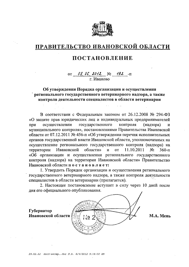 Постановление Правительства Ивановской области от 08.06.2012 N 192-п "Об утверждении Порядка организации и осуществления регионального государственного ветеринарного надзора, а также контроля деятельности специалистов в области ветеринарии"