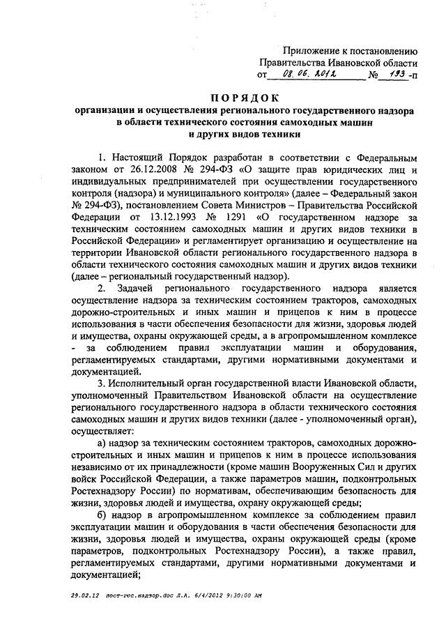 Постановление Правительства Ивановской области от 08.06.2012 N 193-п "Об утверждении Порядка организации и осуществления регионального государственного надзора в области технического состояния самоходных машин и других видов техники"