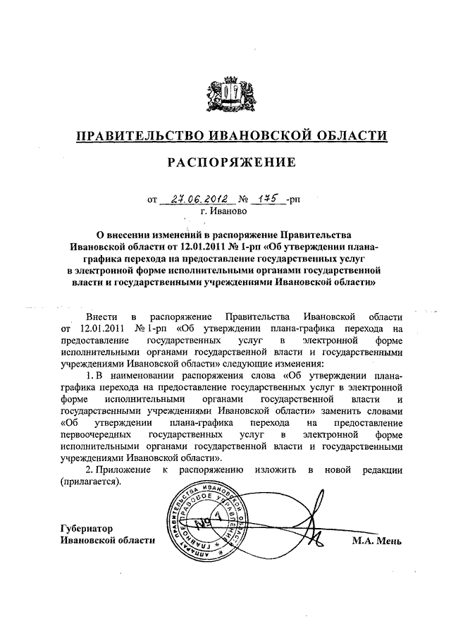 Распоряжение Правительства Ивановской области от 27.06.2012 N 175-рп "О внесении изменений в распоряжение Правительства Ивановской области от 12.01.2011 N 1-рп "Об утверждении плана-графика перехода на предоставление государственных услуг в электронной форме исполнительными органами государственной власти и государственными учреждениями Ивановской области"