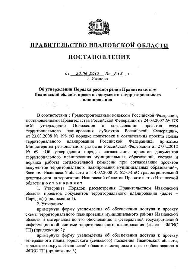 Постановление Правительства Ивановской области от 27.06.2012 N 217-п "Об утверждении Порядка рассмотрения Правительством Ивановской области проектов документов территориального планирования"