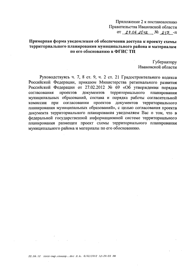 Постановление Правительства Ивановской области от 27.06.2012 N 217-п "Об утверждении Порядка рассмотрения Правительством Ивановской области проектов документов территориального планирования"