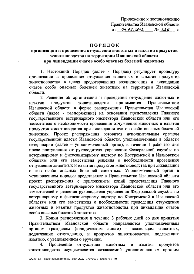Постановление Правительства Ивановской области от 04.07.2012 N 228-п "Об утверждении Порядка организации и проведения отчуждения животных и изъятия продуктов животноводства на территории Ивановской области при ликвидации очагов особо опасных болезней животных"