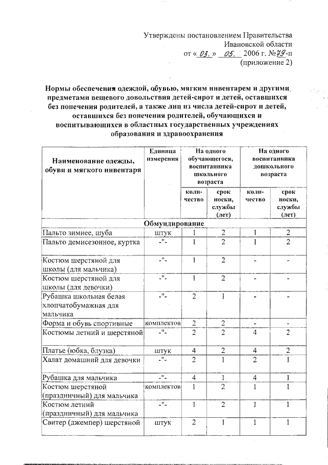 Постановление Правительства Ивановской области от 03.05.2006 N 79-п "О нормах материального обеспечения детей-сирот и детей, оставшихся без попечения родителей, а также лиц из числа детей-сирот и детей, оставшихся без попечения родителей, обучающихся и воспитывающихся в областных государственных учреждениях образования и здравоохранения"