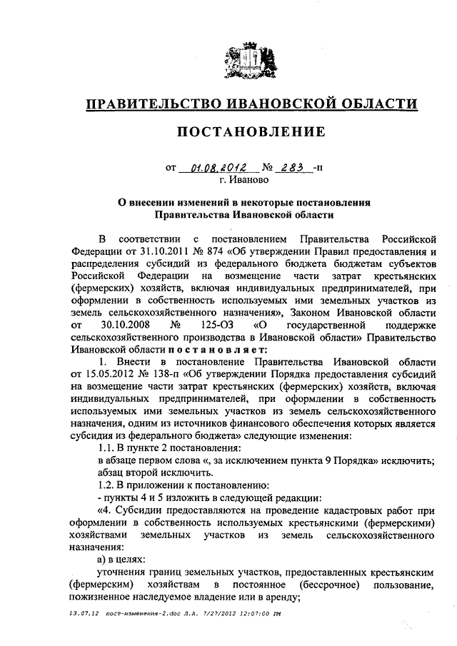 Постановление Правительства Ивановской области от 01.08.2012 N 283-п "О внесении изменений в некоторые постановления Правительства Ивановской области"