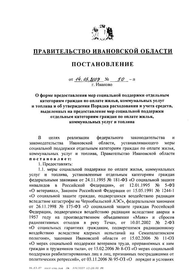 Постановление Правительства Ивановской области от 14.03.2007 N 50-п "О форме предоставления мер социальной поддержки отдельным категориям граждан по оплате жилья, коммунальных услуг и топлива и об утверждении Порядка расходования и учета средств, выделенных на предоставление мер социальной поддержки отдельным категориям граждан по оплате жилья, коммунальных услуг и топлива"