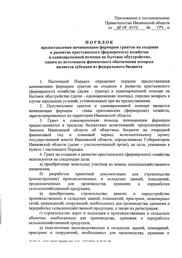 Постановление Правительства Ивановской области от 08.06.2012 N 194-п "Об утверждении Порядка предоставления начинающим фермерам грантов на создание и развитие крестьянского (фермерского) хозяйства и единовременной помощи на бытовое обустройство, одним из источников финансового обеспечения которых является субсидия из федерального бюджета"